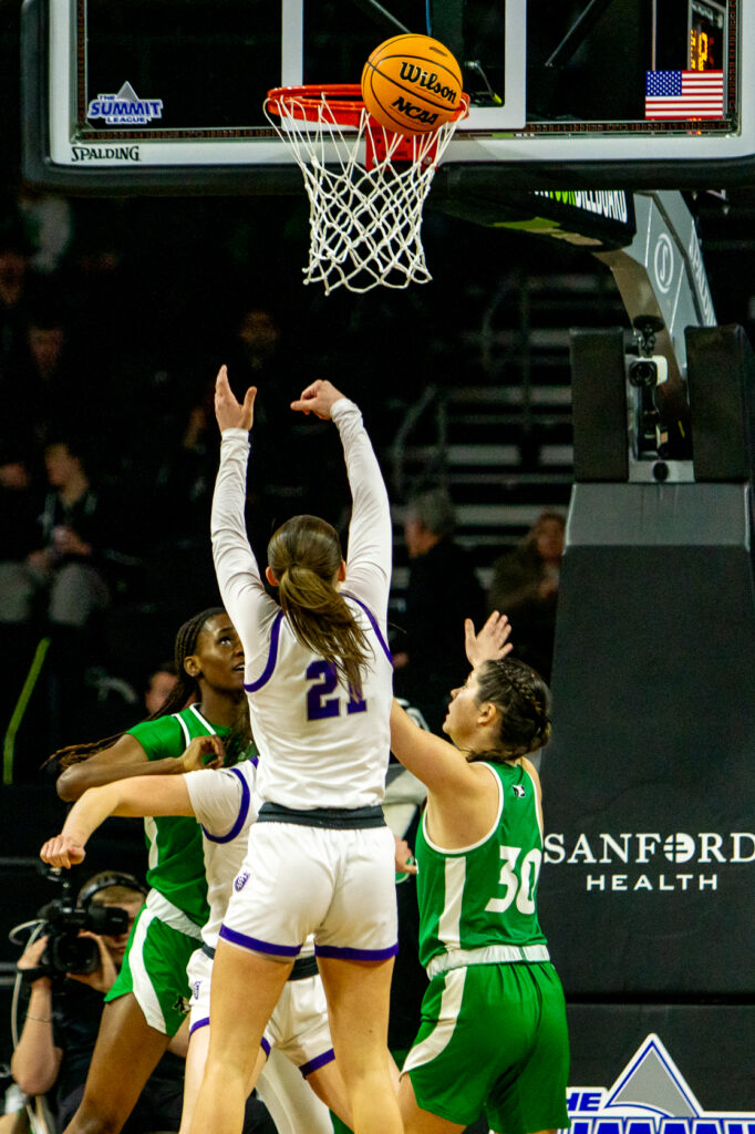 Despite senior center Jo Langbehn’s 26-point performance Friday afternoon, the St. Thomas women’s basketball team couldn’t outpace the University of North Dakota, and fell 80-67 at the Denny Sanford Premier Center in Sioux Falls.