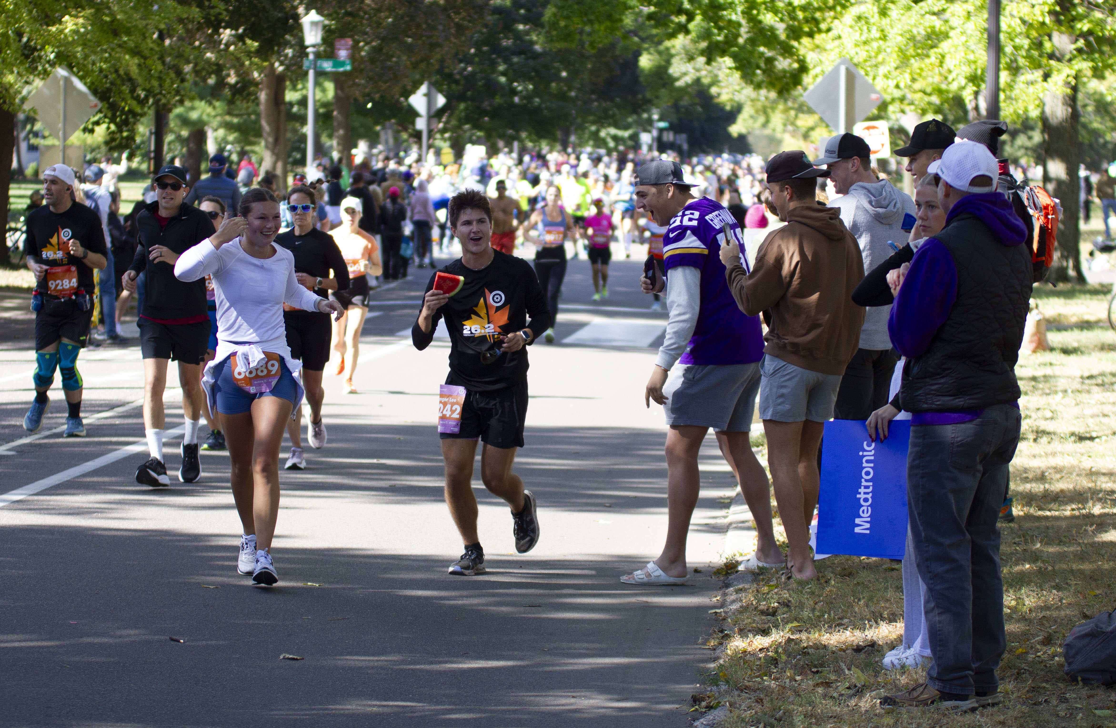 Runners pass by the University of St. Thomas St. Paul campus. Thousands participated in the Twin Cities Marathon on Oct. 6, 2024. (Eli Andersen/The Crest)