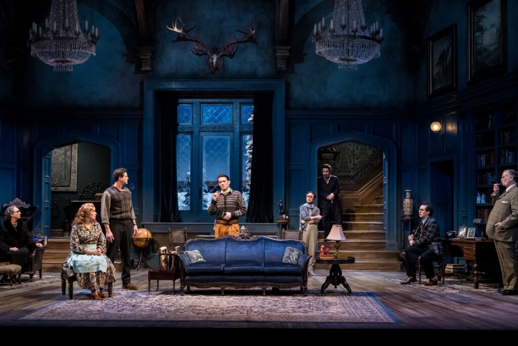 I have seen my fair share of shows, and therefore my fair share of set designs, but this one might be a top favorite of mine. I walked into the theater and audibly said, “wow” upon seeing the stage. The living room depicted is gorgeous, with the deep blue on the walls just dark enough to set the scene, and the black decorative elements on the ceiling reminded me of Gothic architecture. This, paired with two crystal chandeliers, resembles a scene from the Haunted Mansion at Disney World, which is fitting due to the tragedies that happen in both of those locations.