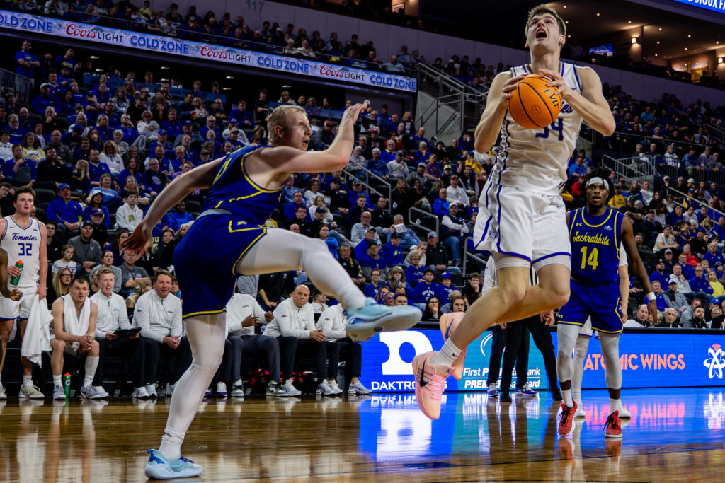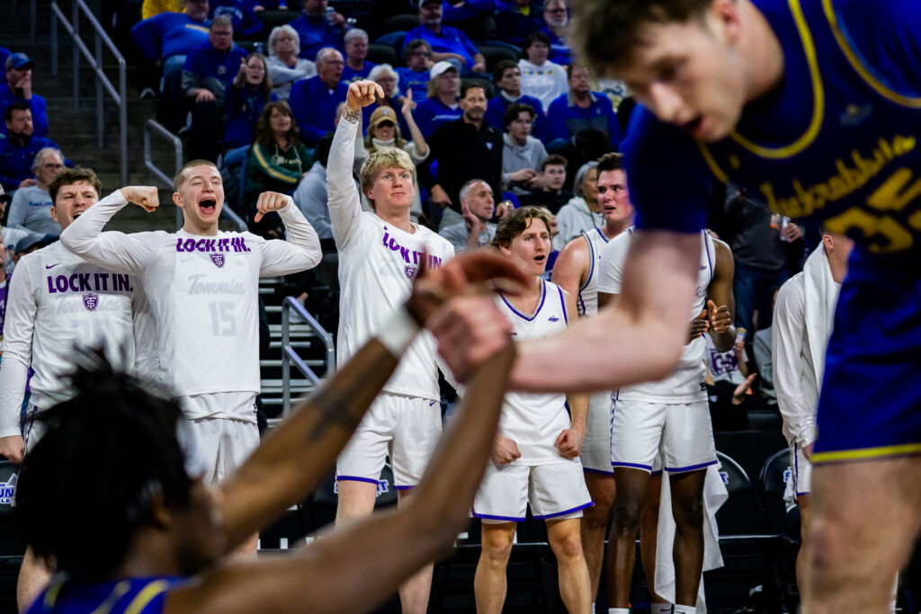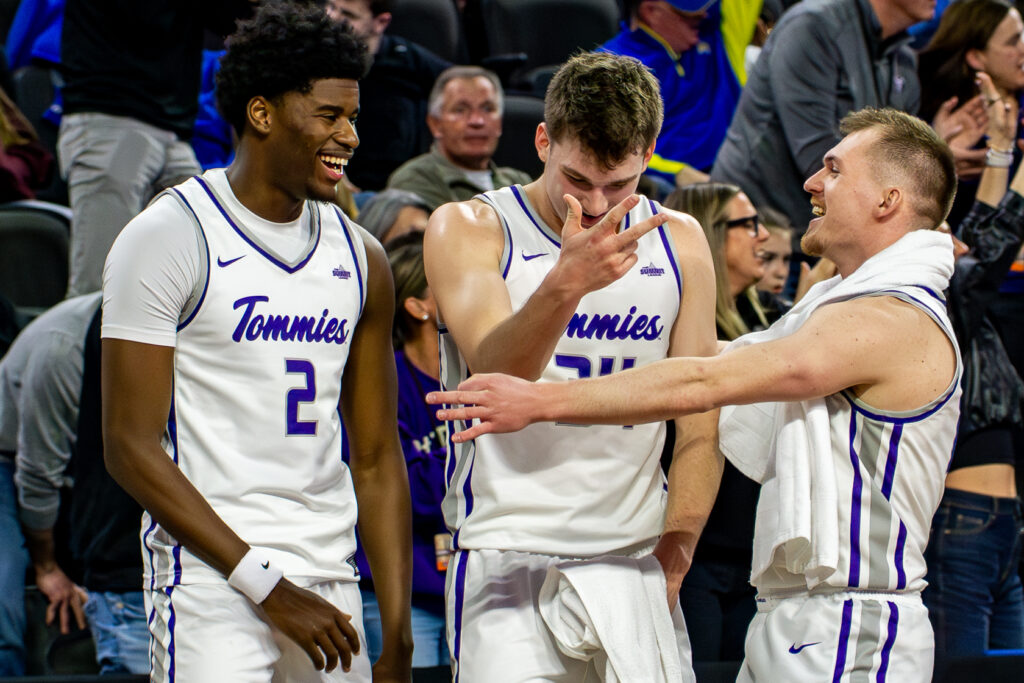 Sophomores forward Ben Oosterbaan and guard Nolan Minessale led St. Thomas men’s basketball to a 80-67 Summit League quarterfinal victory over South Dakota State Thursday at the Denny Sanford Premiere Center in Sioux Falls, South Dakota.